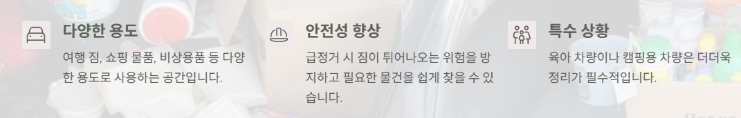 - 업무용 차량:샘플, 서류, 업무 도구 등은 정리함 내 섹션을 나눠 보관하면 차량 이동 중 흔들림을 줄일 수 있고, 외부 미팅 시 바로 꺼내 쓸 수 있어 효율적입니다.