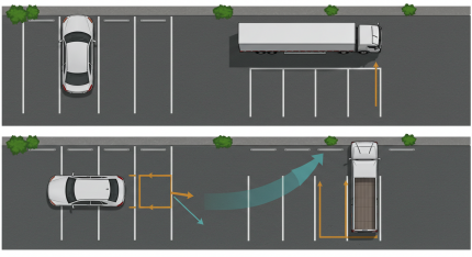 - 거리선 중 빨간 선은 0.5m: 트렁크 여닫을 여유 있는 거리입니다.